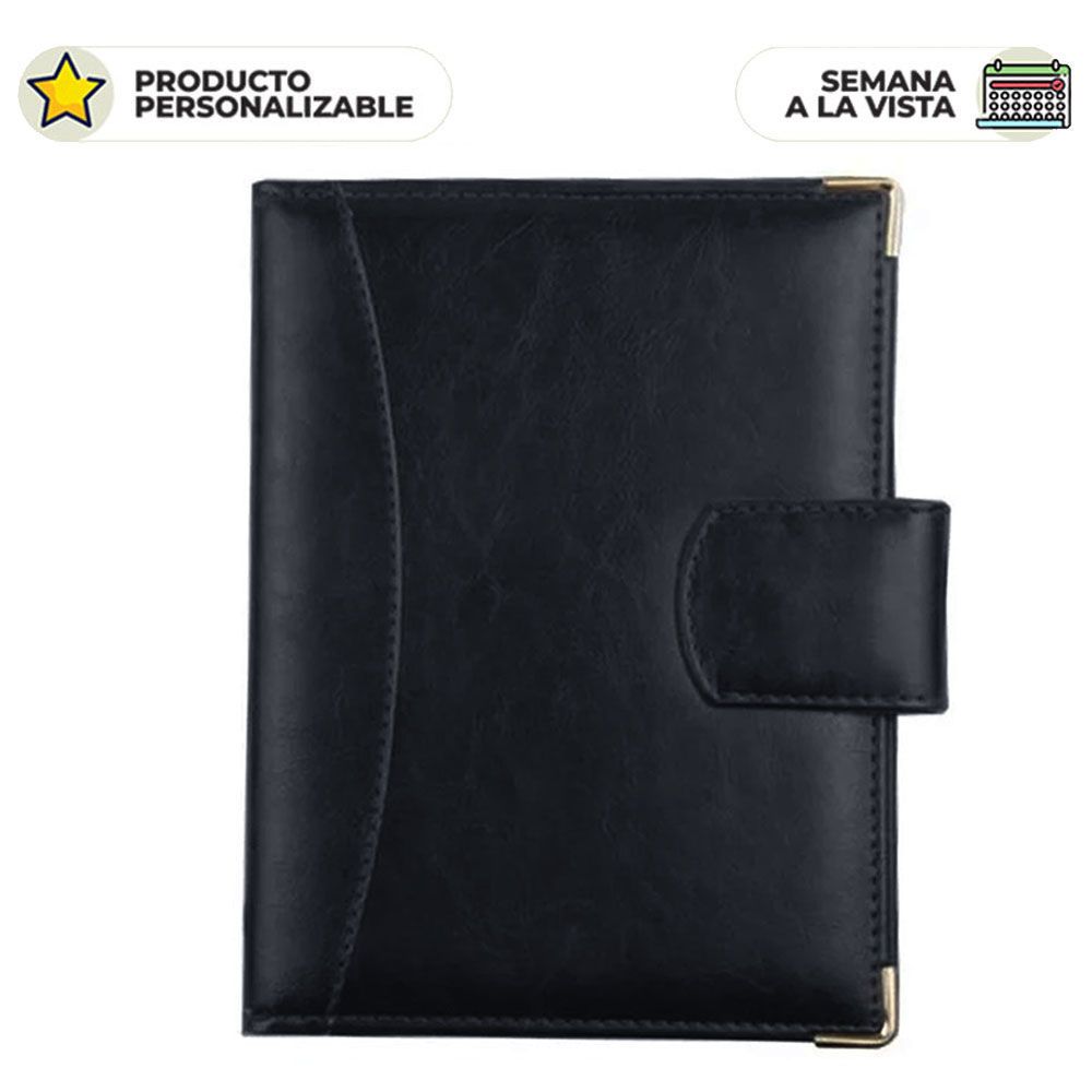- Cubierta acolchada cosida, solapa interior, esquineros y presilla con broche imantado.