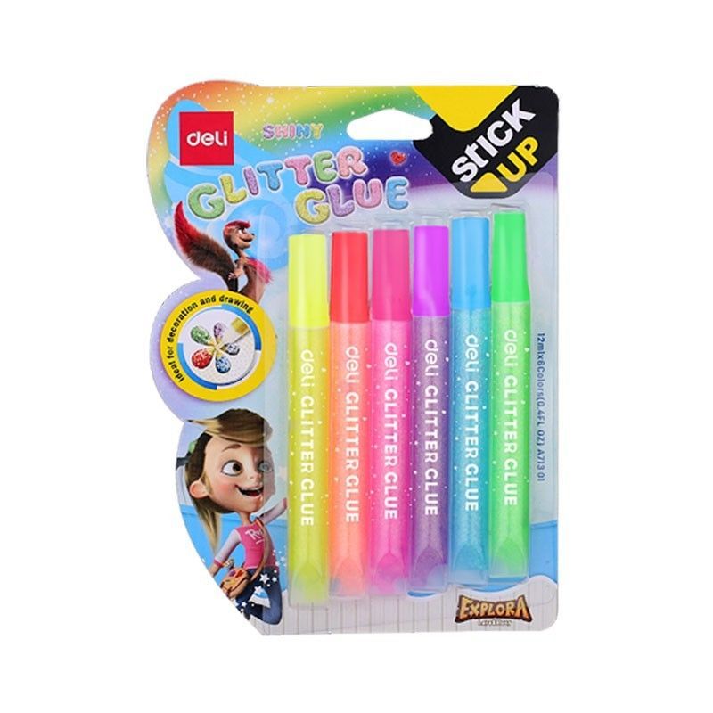 Adhesivo con Glitter 6 Colores 12ml Deli- Adhesivo con glitter con goma líquida para utilizar en manualidades con tonos neón de máxima calidad con gran brillo y poder cubritivo. - Pico tipo bolígrafo para escribir y crear hermosos diseños y decoraciones.- Contiene 6 unidades de 12ML cada una. - Lavable, seca en 30 minutos. - No Tóxico.
