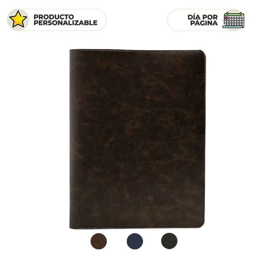 Agenda Diaria 2022 con cubierta flexible símil cuero en varios colores: Azul, marrón o negra.