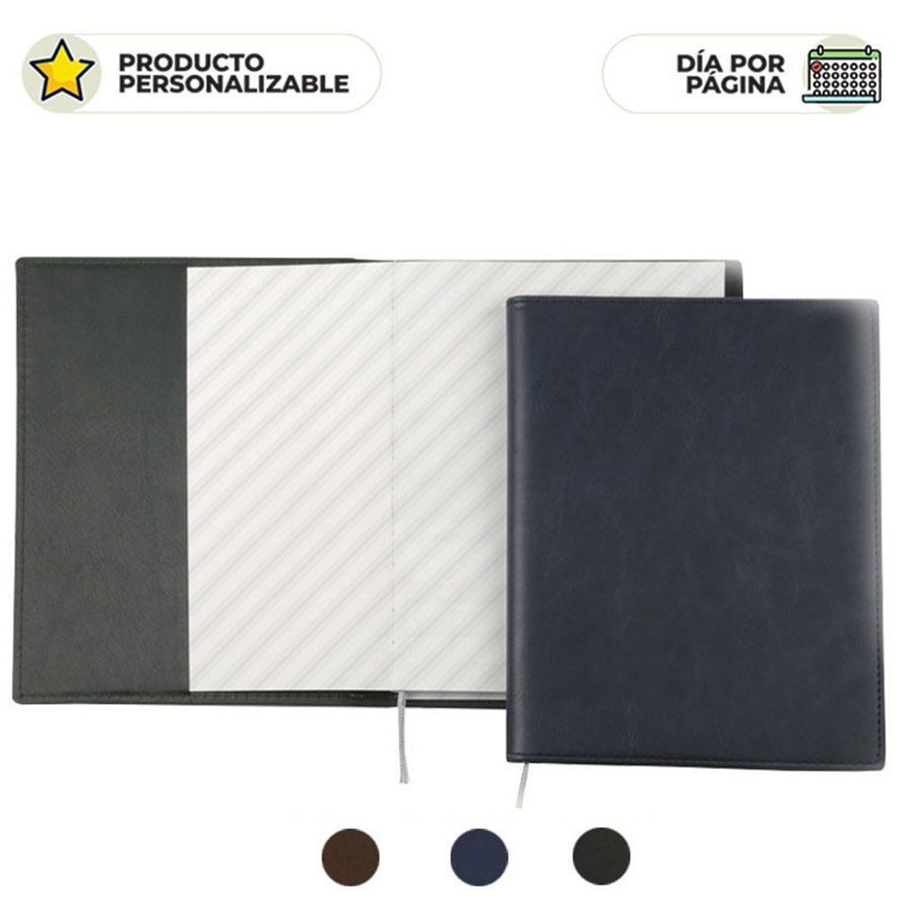 Agenda diaria 2022 con cubierta semidura con solapa interior y costuras artesanales. Colores Disponibles: Negro, marrón o azul.