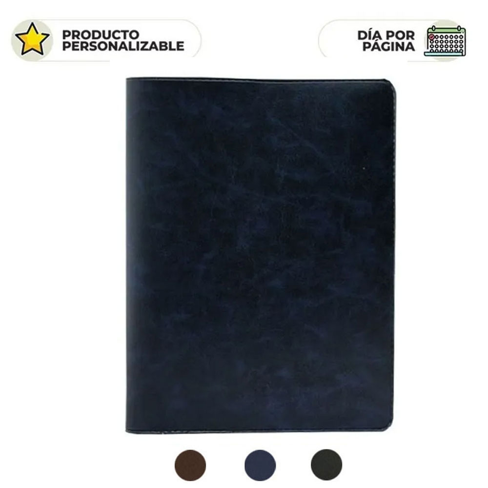 Agenda Diaria 2025 con cubierta flexible símil cuero en varios colores: Azul, marrón o negra.