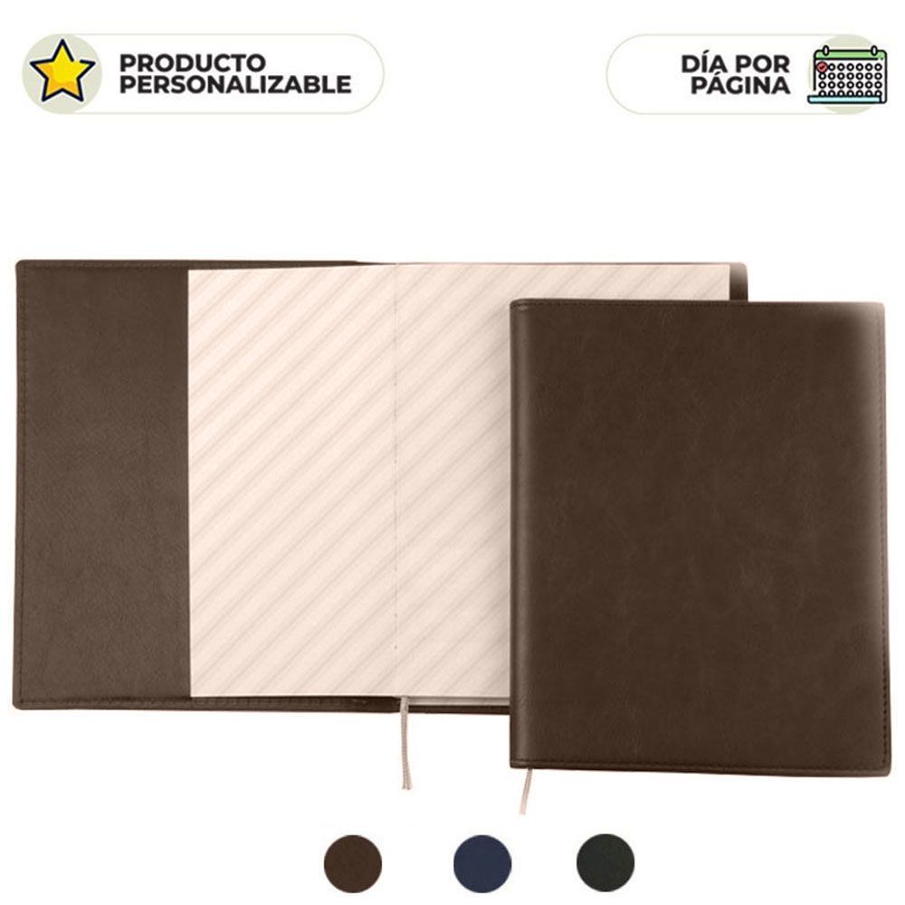 Agenda diaria 2024 con cubierta semidura con solapa interior y costuras artesanales. Colores Disponibles: Negro, marrón o azul.