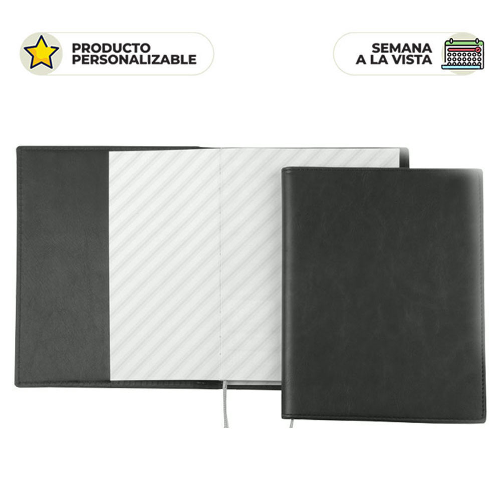- Cubierta semidura, solapa interior y costuras artesanales.
