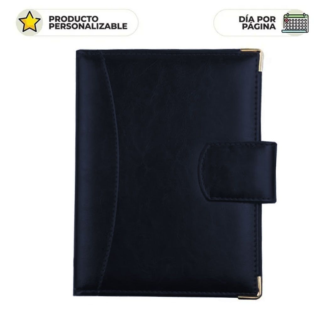 Agenda 2025 diaria con cubierta acolchada cosida, solapa interior, esquineros y presilla con broche imantado. Colores Disponibles: Negro, marrón o azul.