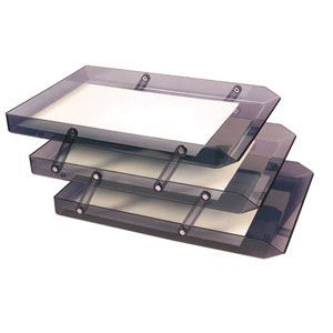 Bandeja plástica apilable transparente de color humo x3, permite mantener organizados los papeles sobre el escritorio.