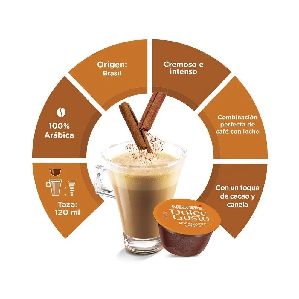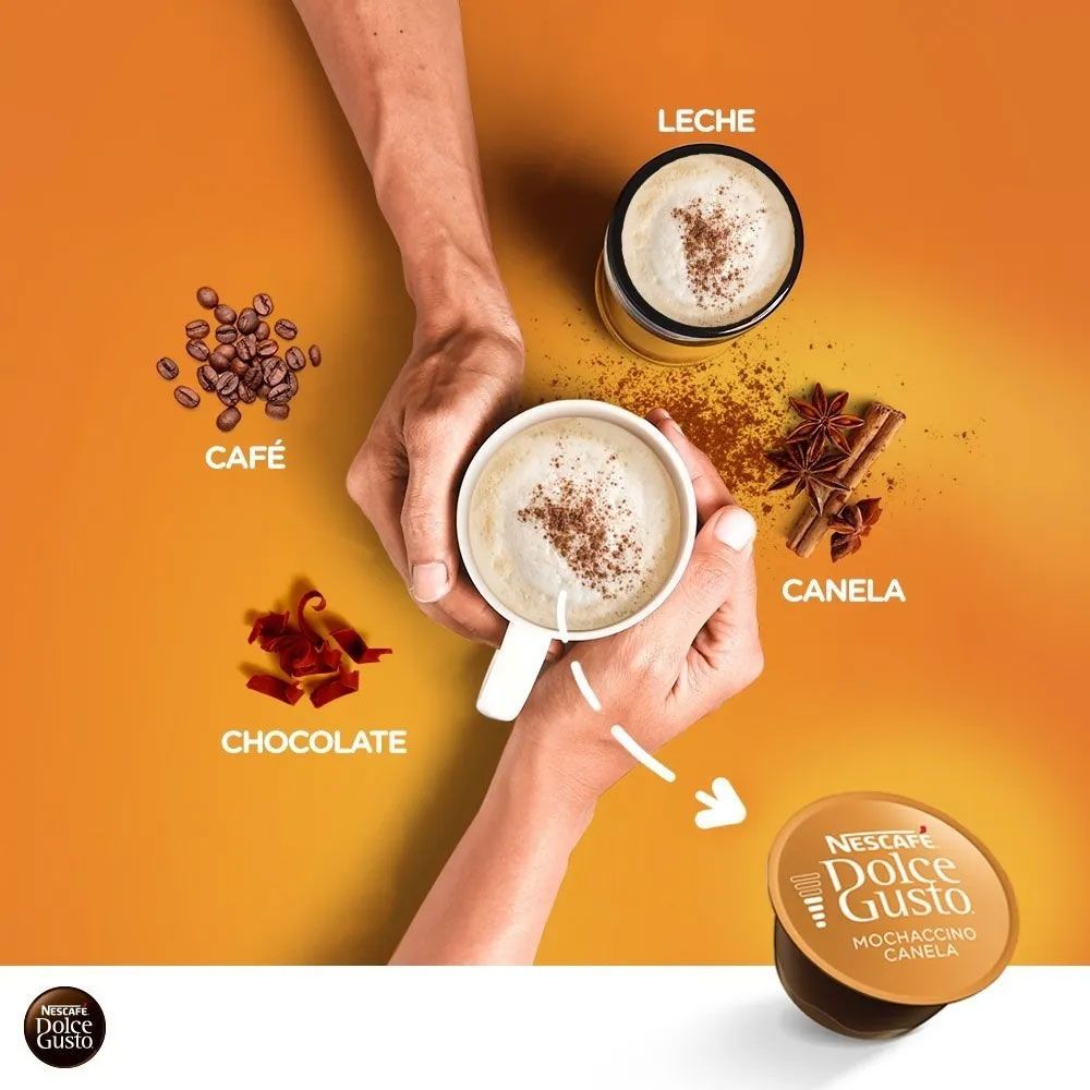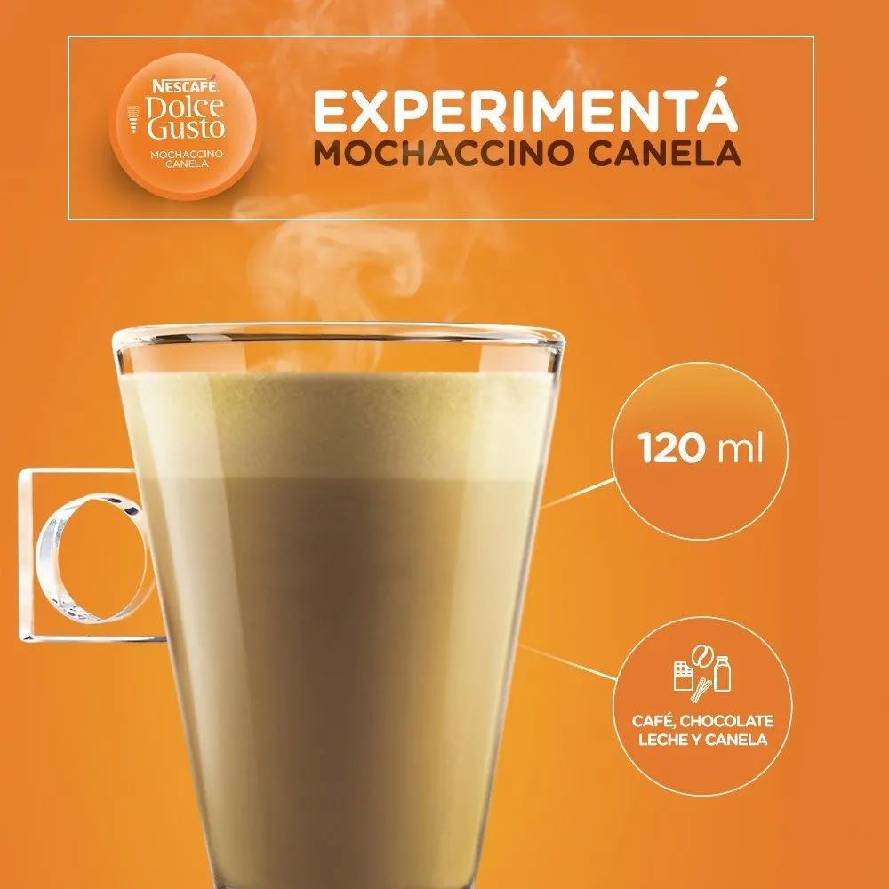 - Conocé NESCAFÉ® Dolce Gusto® Mochaccino Canela, una bebida alta increíblemente cremosa compuesta por leche, café, chocolate y un toque canela. ¡No te podés perder esta exclusiva nueva variedad!