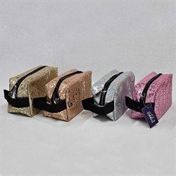 Cartuchera con un compartimento y cierre, texturizada y estampado de glitter, fácil de transportar gracias a su asa en uno de los extremos. Presentación en 4 colores: Plateado, Dorado, Cobre y Rosado.