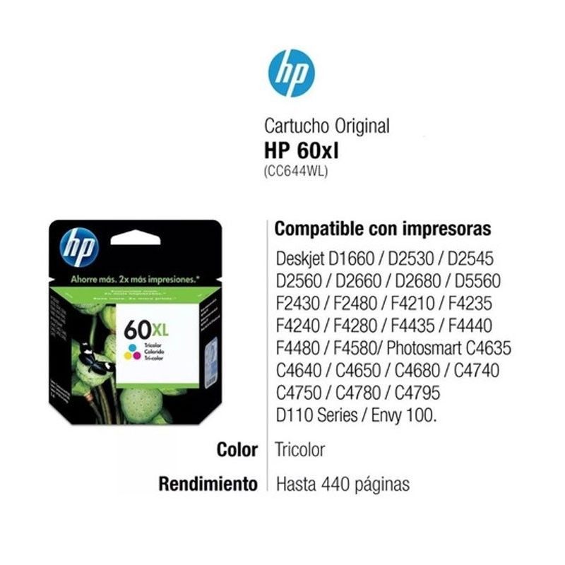Cartucho Original Hp 60XL Color D2500 C4780 F4580- Compatibilidad: Deskjet D2500 Series, Deskjet D2530, Deskjet D2560, Deskjet D2660, Deskjet F4200 Series, Deskjet F4230, Deskjet F4235, Deskjet F4240, Deskjet F4250, Deskjet F4272, Deskjet F4273, Deskjet F4274, Deskjet F4275, Deskjet F4280, Deskjet F4283, Deskjet F4288, Deskjet F4292, Deskjet F4293, Deskjet F4240, Deskjet F4280, Deskjet F4480, Deskjet F4580, Photosmart C4600 Series, Photosmart C4780.- Rendimiento: 440 páginas.