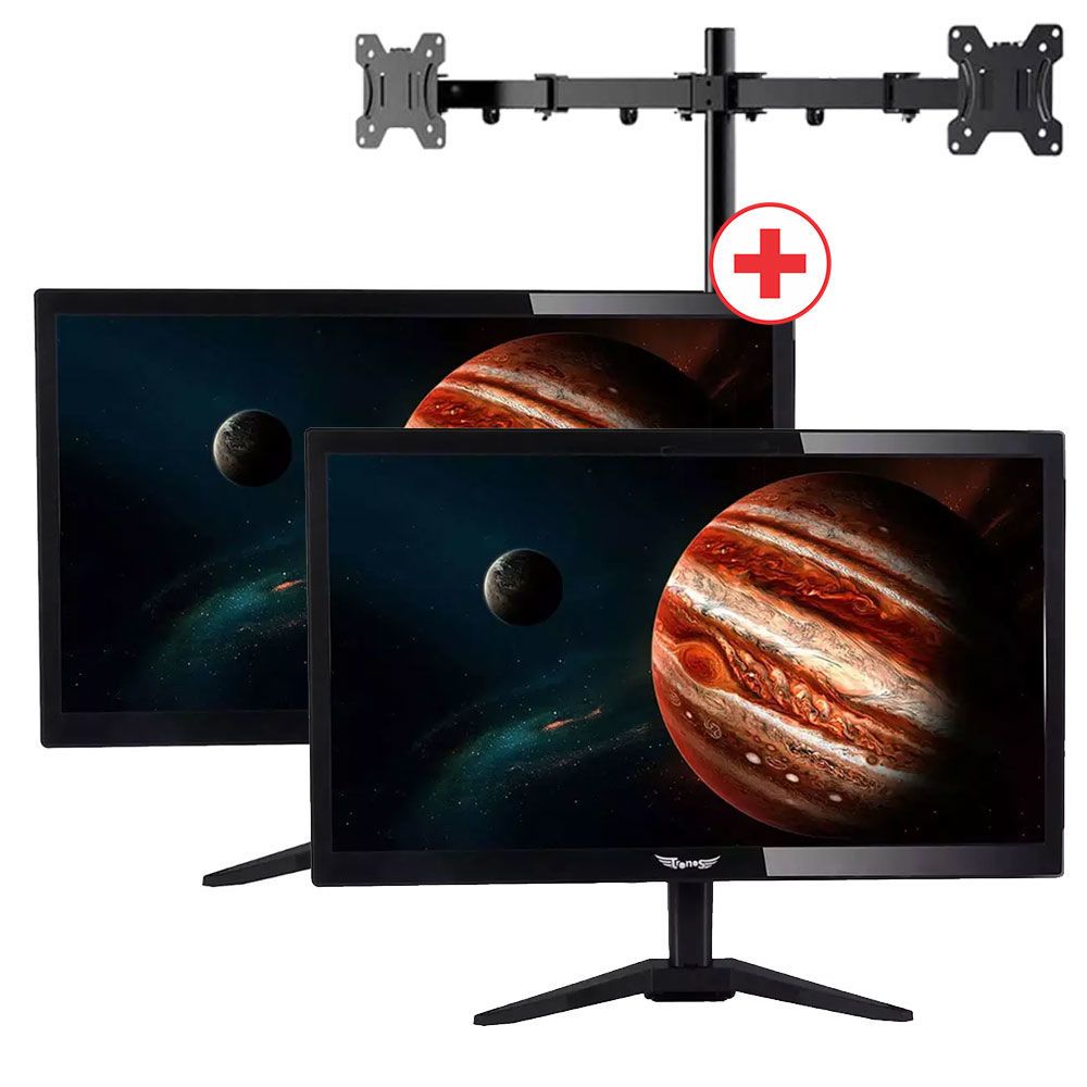 Monitor Tronos 19 pulgadas LED resolución de 1366px x 768px, frecuencia de 60Hz combina un alto rendimiento de visualización y una estructura liviana + Soporte doble monitor brinda ergonomía, además, no es necesario perforar la mesa para utilizarlo, su fijación es tipo tornillo de banco. Cuenta con ajuste de altura, inclinación y rotación, y permite su uso en modo retrato u paisaje. Compatible con monitores de 10 a 27 pulgadas