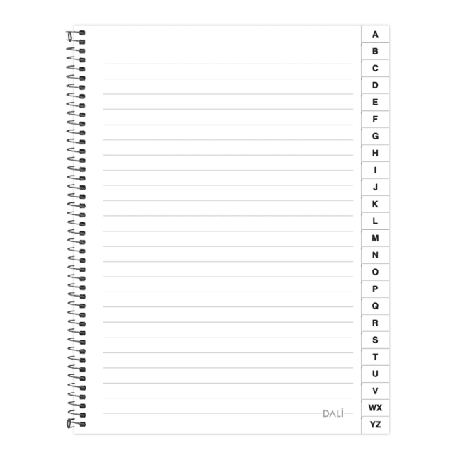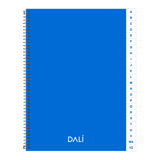 Marca: DaliLínea: Con ÍndiceModelo: 18x23cmTipo de producto: CuadernoLargo x Ancho23 cm x 18 cmTipo de hoja: RayadaCantidad de hojas: 72
