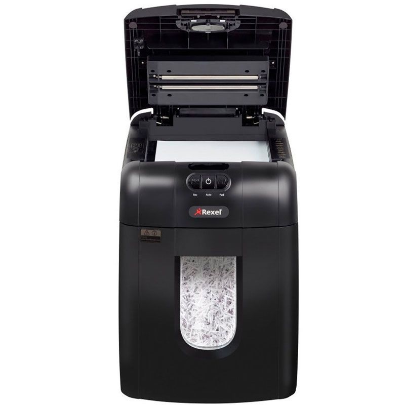 - Destroza hasta 6 folios (80 gsm) a la vez en el modo manual/130 folios en el modo automático, funcionamiento ultrasilencioso < 60 dbA.