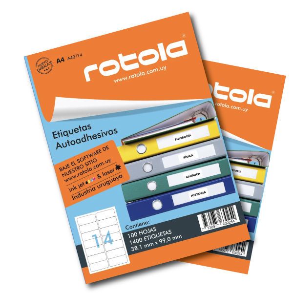 Etiquetas Imprimibles Rotola A4/14 1400 Unidades 99 x 38 mm- Color: Blanco.- Presentación: 100 hojas, 1400 etiquetas.- Medida: 99 x 38 mm.- Referencia: A43/14.- Observaciones: Para impresora láser y chorro de tinta.