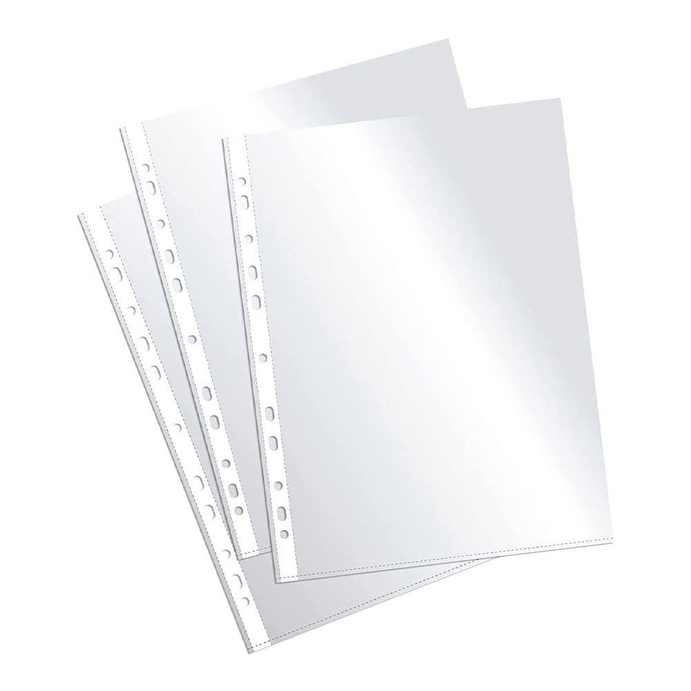 Cubiertas A4 FW de 50 micrones, reforzadas con perforación universal (para cualquier carpeta). Márgenes reforzados. El material es antireflejo y permite que las hojas se deslicen de manera fácil hacia el interior.