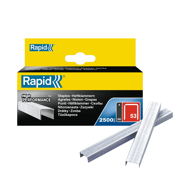 Grapa 53/14 x2500 Rapid- Grapas 53/14 de alto rendimiento.- Uso en exteriores gracias a la superficie galvanizada resistente a la corrosión.- Para sujetar materiales como alfombras, láminas de plástico y letreros a la madera y al tablero.- penetración óptima del material gracias a las patas de corte de precisión, deja agujeros de 1 mm.- Alambre resistente de alto rendimiento, duradero gracias a la construcción de acero galvanizado.- Contenido: 2500 piezas. - Ancho x alto x profundidad: 5 x 3 x 12 cm, peso: 310 g.