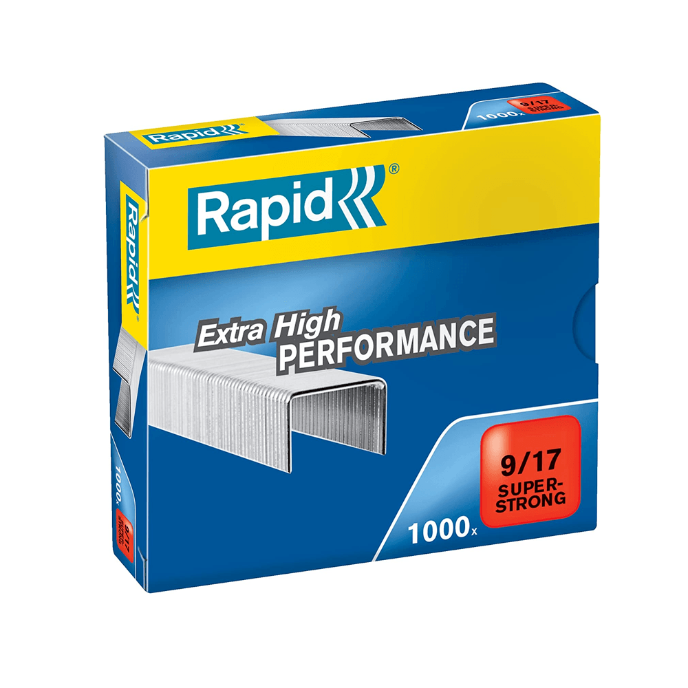 Grapas 9/17 x1000 capacidad de perforación de hasta 140 hojas, 17 mm de profundidad alambre superreforzado galvanizado para el mejor rendimiento. Presentación en caja de 1000 unidades
