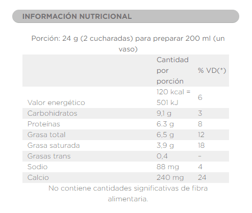 | Valor energetico | 120 Kcal= 501 kJ |