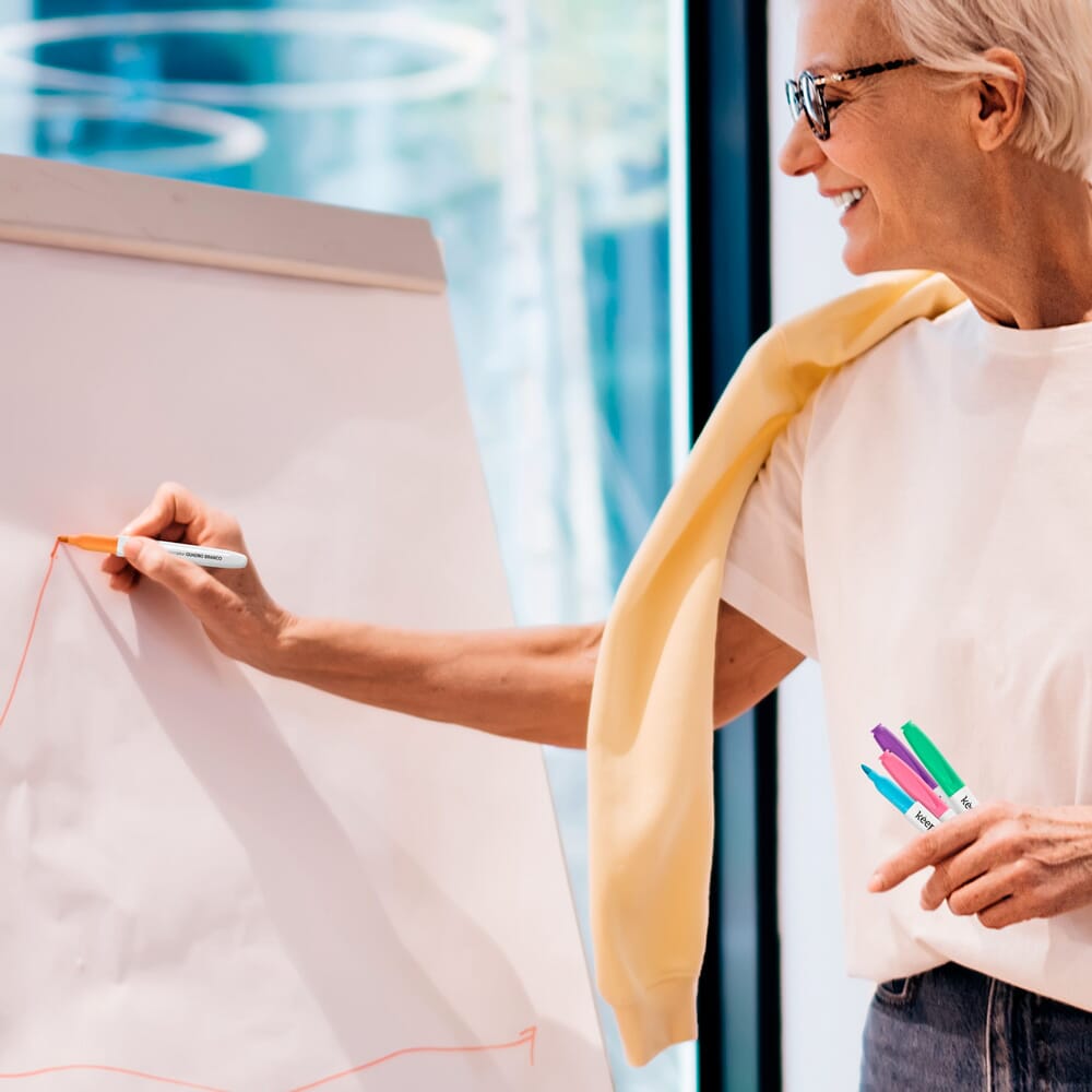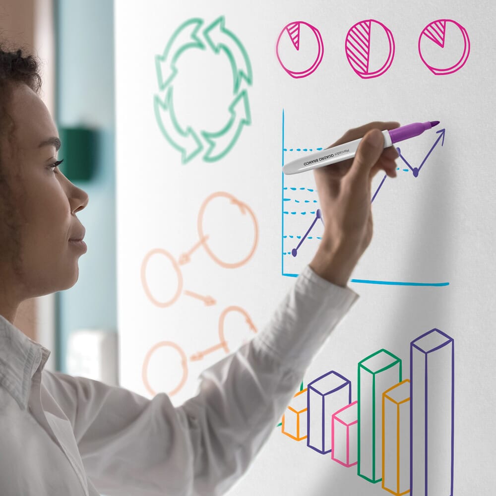 Marcador para pizarra con punta fina de 1.0mm, escritura suave, alta durabilidad y fácil de limpiar.
