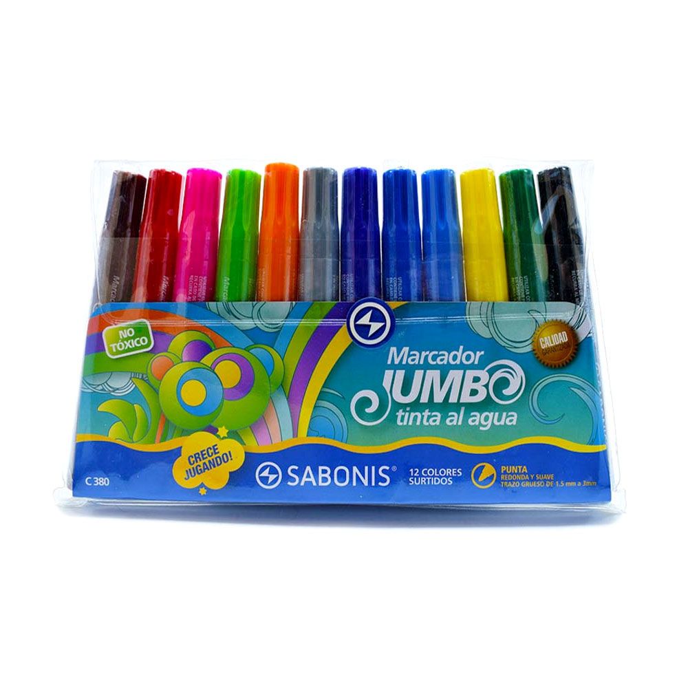 Marcador Jumbo Sabonis C380 por 12 colores intensos, punta redonda y suave, lavables, tinta al agua no tóxica, no traspasa el papel y de secado rápido, ideal para escribir, colorear y rotular sobre papel, cartón y madera.