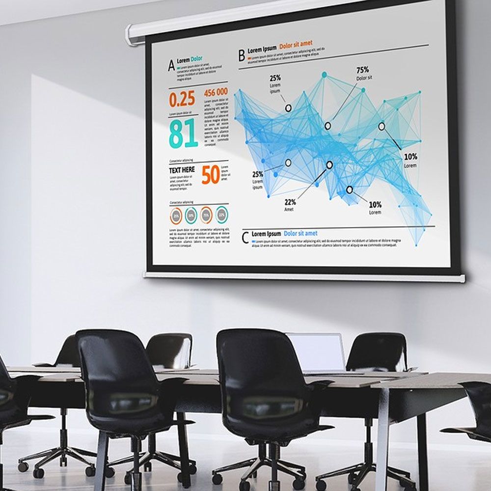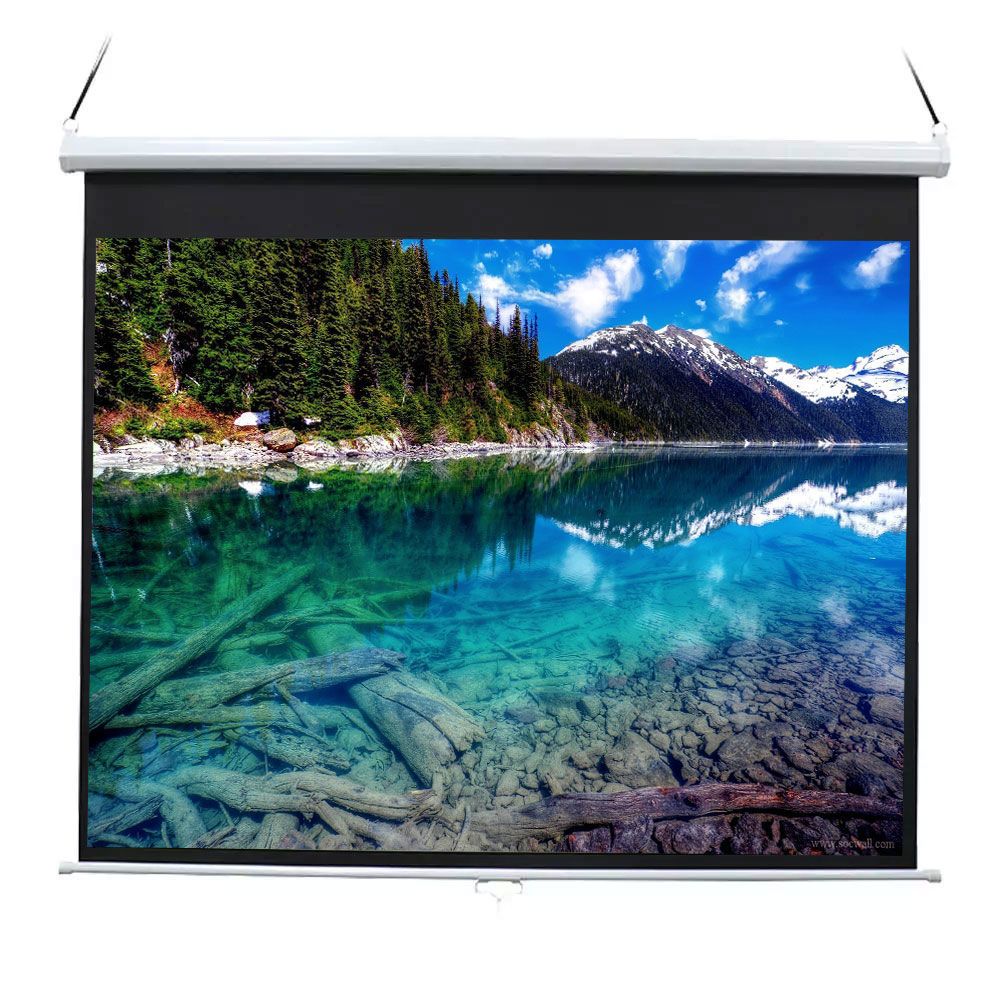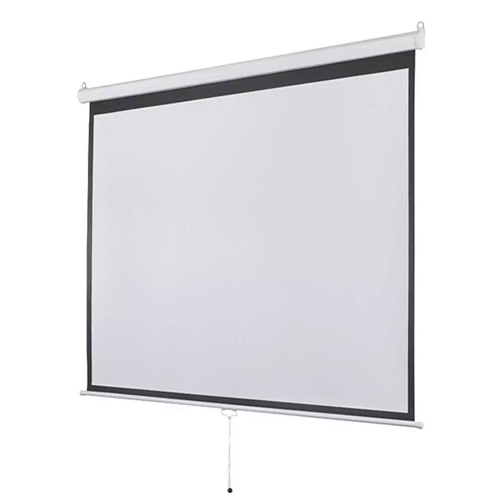 Pantalla de protección retráctil de 97" , te permite fijarlo al techo y a la pared, dispone de una superficie blanca mate y negro en la parte trasera, accionamiento manual, cuerda automática y area de proteccion de 1780 x 1780mm