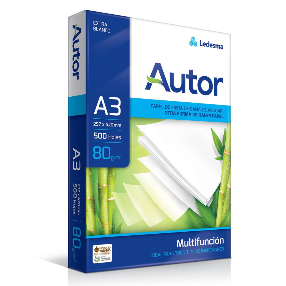 Resma de papel Autor A3 de color blanco, contiene 500 hojas de 80g cada una, extra blanco hecho a partir de fibras del caña de azúcar