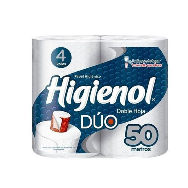 Papel Higiénico Higienol Duo Doble Hoja 50Mts X4Higienol Dúo presenta una revolucionaria innovación, sustituyendo el centro habitual de cartón por un práctico mini rollo de papel higiénico portable. Con Dúo podés llevar la calidad de Higienol a todas partes.- Tipo de hoja: doble hoja.- Unidades: 4 Rollos.- Longitud: 50 metros.