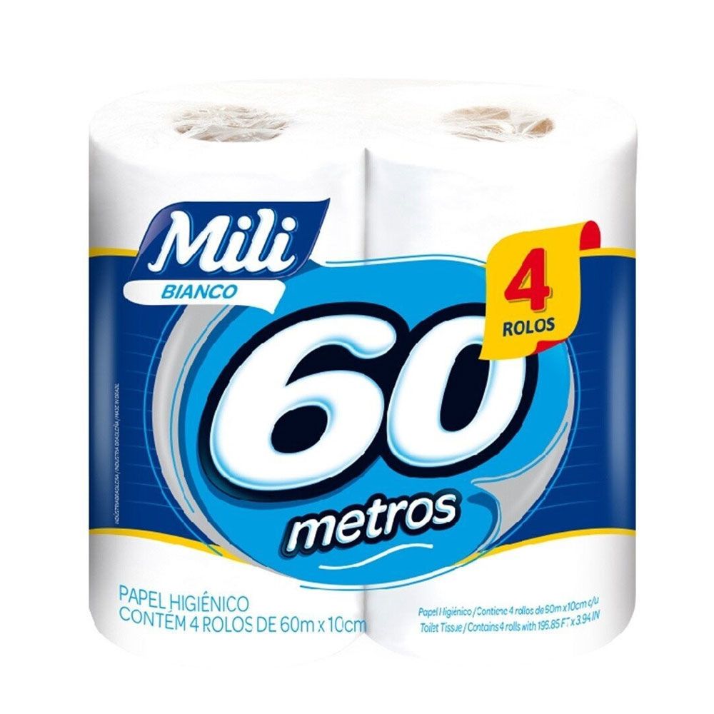 Papel Higiénico Mili pack por 4 rollos de 60 metros hoja doble de alta calidad y rendimiento gracias a sus dos hojas y su textura panal de alta absorción.