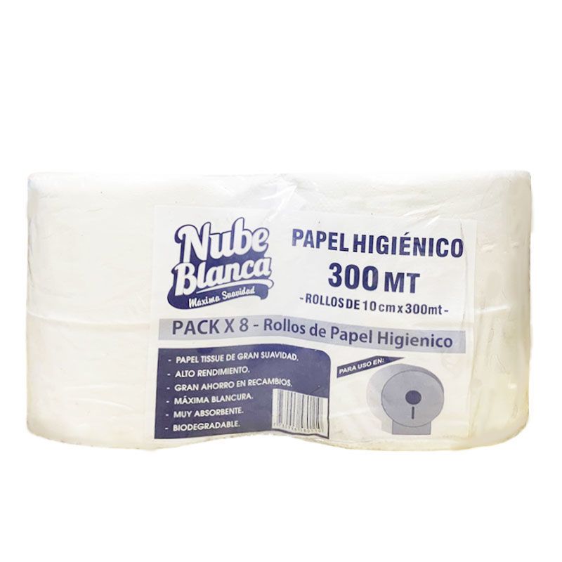 Papel Higiénico Nube Blanca Jumbo Hoja Simple 300m x8, muy absorbente y de gran suavidad