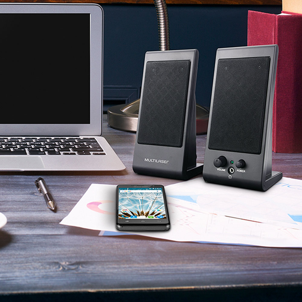 Con la tecnología de conexión Plug and Play, conecte la entrada de audio P2 y la alimentación USB, y comience a usar. El parlante tiene 3W Rms de potencia, diseño estéreo, además de control de volumen