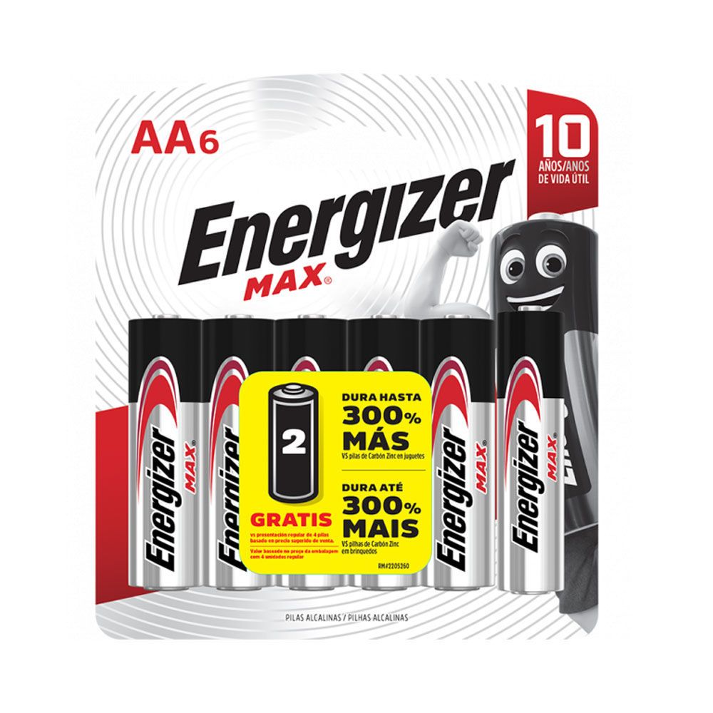 Pila alcalina con la que cuentas todos los días para dar energía a los juguetes de tu familia, la electrónica del hogar y las linternas, es aún mejor. Las pilas AA Energizer® MAX® ahora mantienen su carga durante 10 años. Nuestra tecnología patentada Power Seal Technology garantiza que tendrás energía en la que puedes confiar, tanto si estás capturando los primeros pasos del bebé, compitiendo en el nivel final de un maratón de videojuegos o preparándote para una tormenta que se ve en el horizonte
