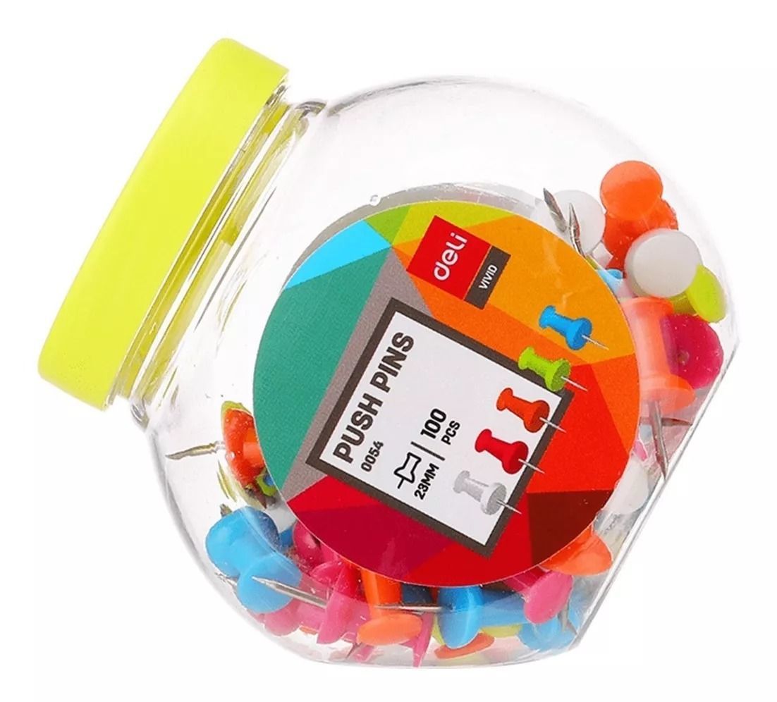 | Características principales | Chinchetas Deli de 23 mm con colores vivos Modelo: 0054 Tamaño: 23 mm para un uso versátil. Empaquetado en juegos para mayor comodidad (Embalaje: Juego) El paquete contiene 100 piezas de alfileres de colores. |