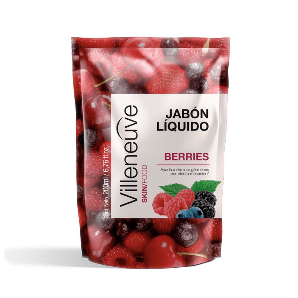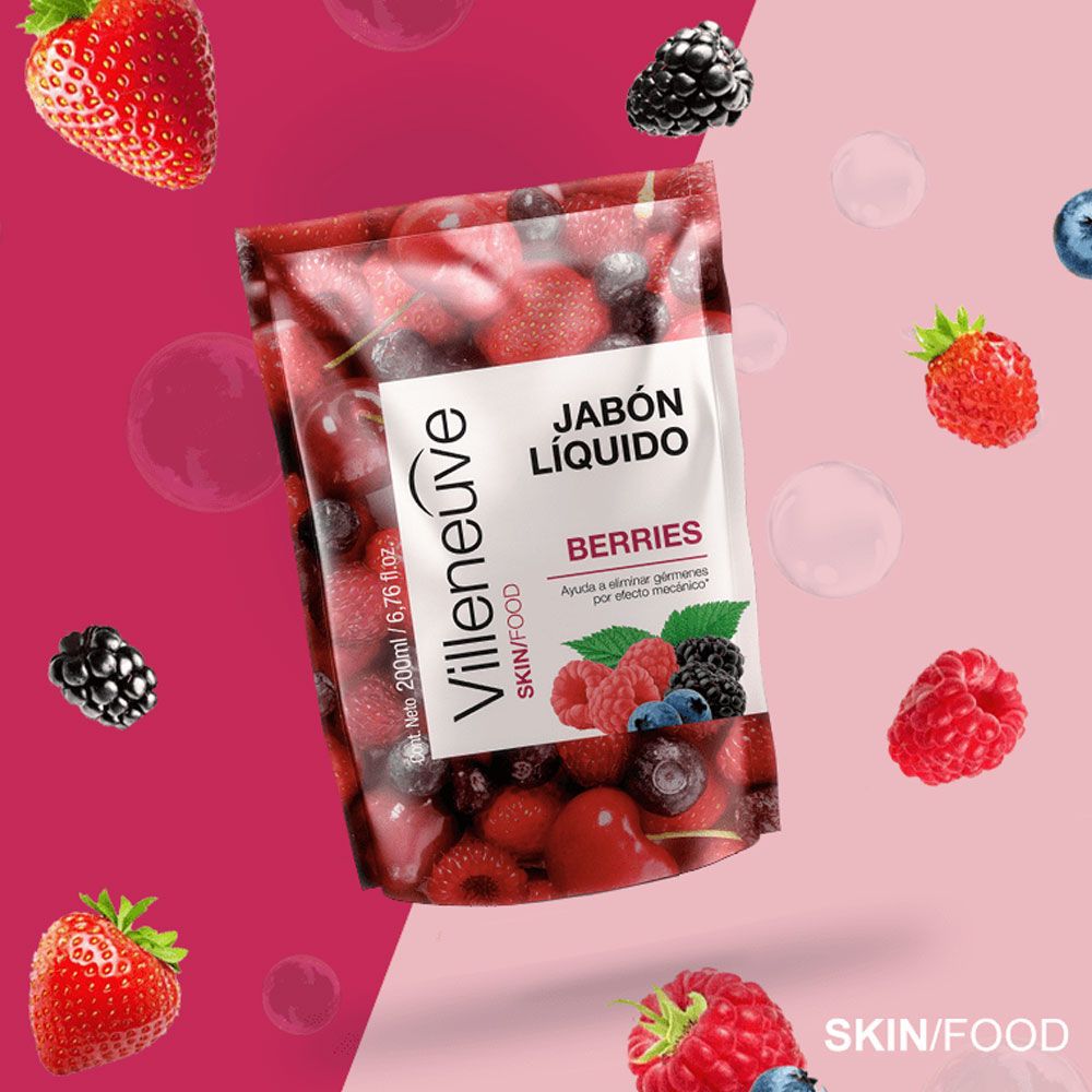- El jabón Líquido Villeneuve Berries con extracto de frutos rojos, de la línea Skin Food, cuida a tu familia eliminando los gérmenes por efecto mecánico en el lavado de manos. - Deja un agradable aroma frutal en la piel.- Certificados por la ONG Te Protejo. Este producto y las materias primas utilizadas en su fabricación no han sido testeadas en animales.