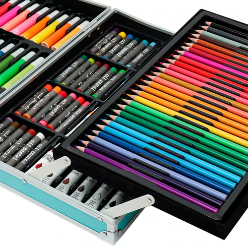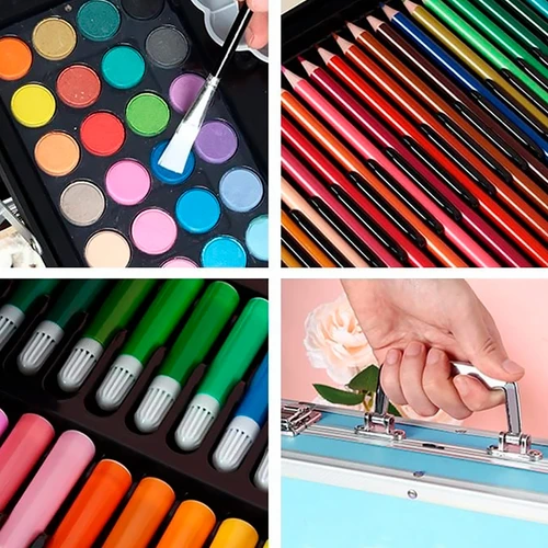 · Incluye: 24 pasteles al óleo, 28 lápices de colores, 24 pinturas acrílicas a base de agua, 33 fibras, 24 pinturas para acuarela, 4 tipos de pinceles, 2 lápices de dibujo, 2 paletas para las pinturas, 2 gomas, sacapuntas de metal y maletín de almacenamiento