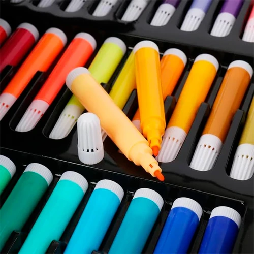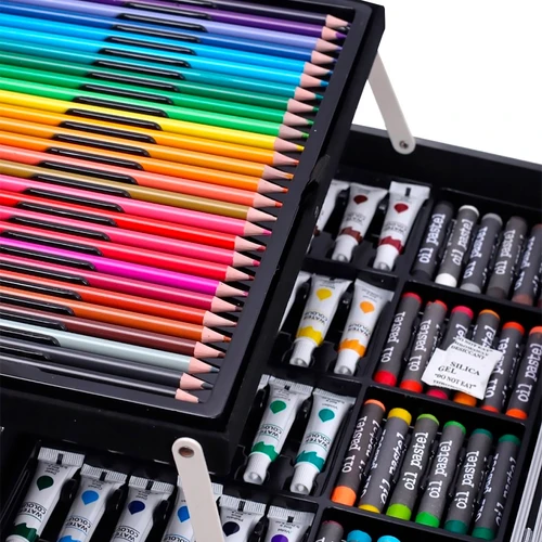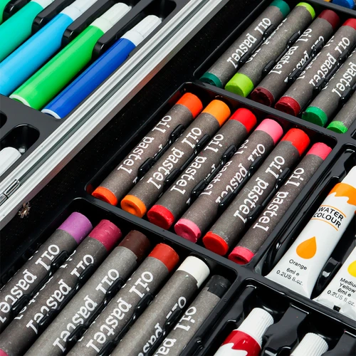 · Incluye: 24 pasteles al óleo, 28 lápices de colores, 24 pinturas acrílicas a base de agua, 33 fibras, 24 pinturas para acuarela, 4 tipos de pinceles, 2 lápices de dibujo, 2 paletas para las pinturas, 2 gomas, sacapuntas de metal y maletín de almacenamiento