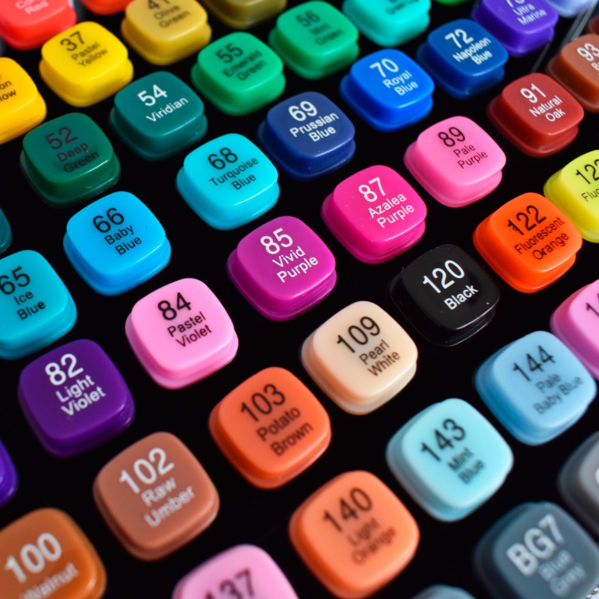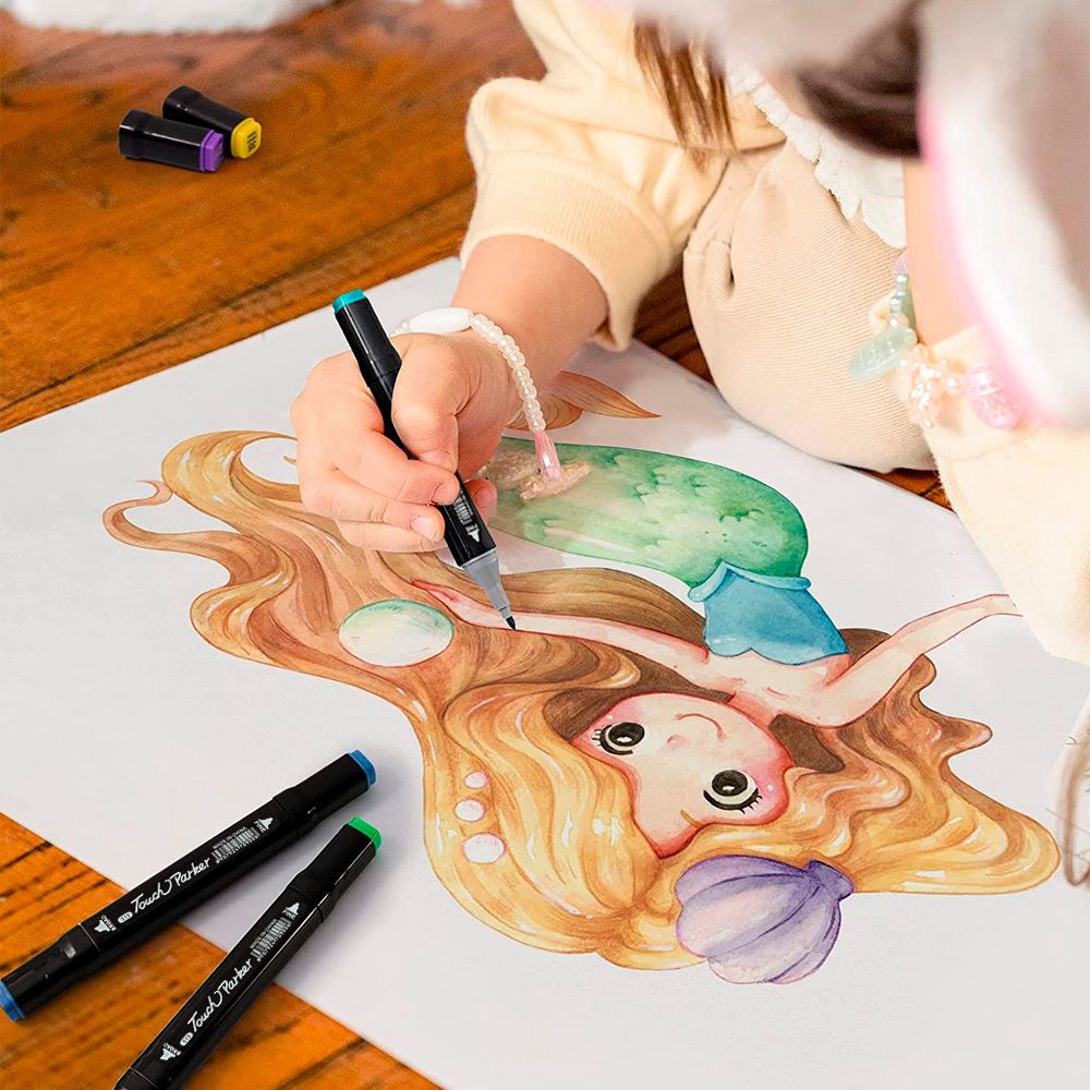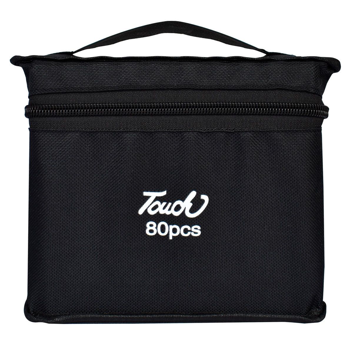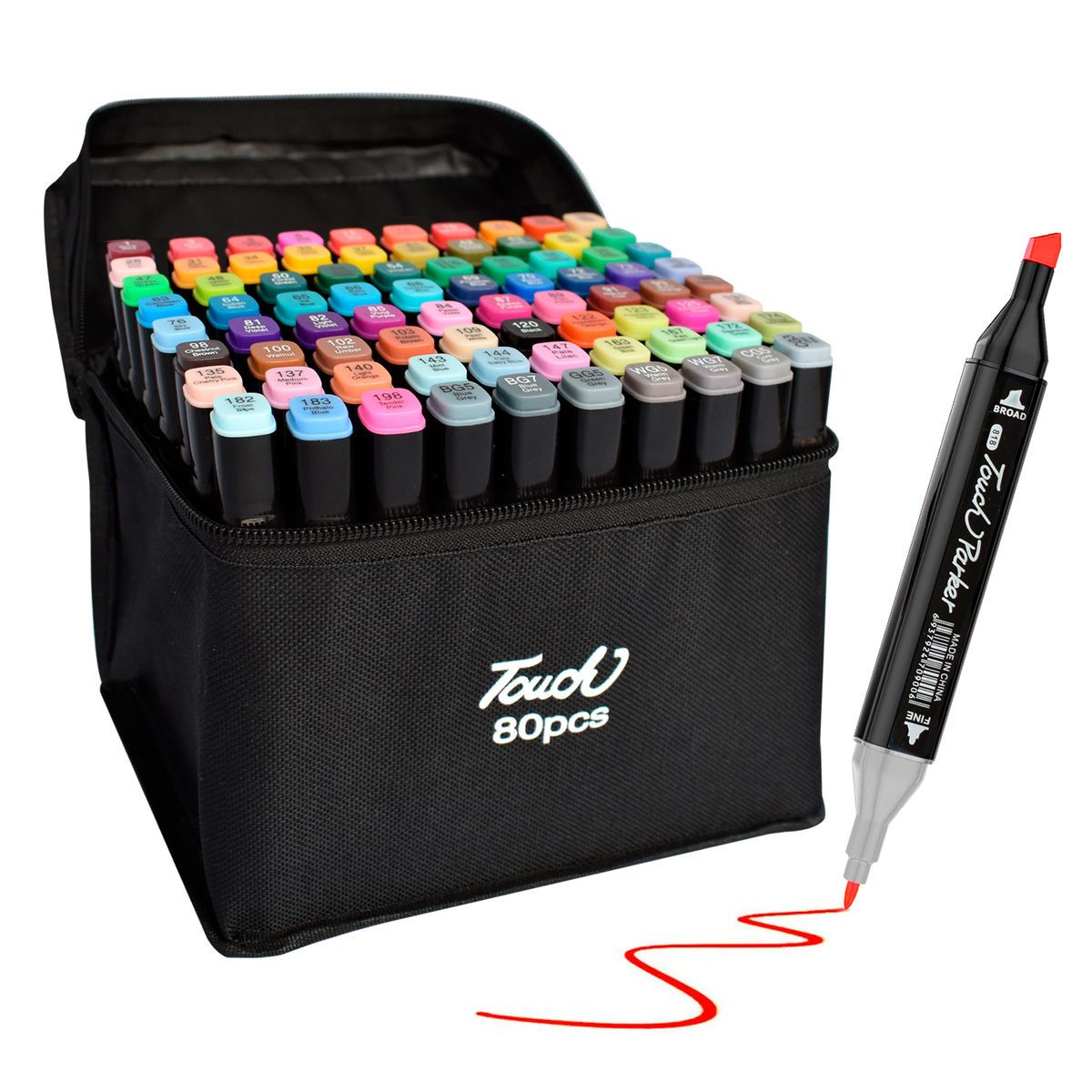 Set de 80 marcadores de secado rápido con doble punta, fabricados en plástico de alta calidad para mayor durabilidad. Incluye estuche organizador con cierre.