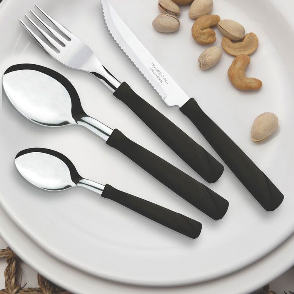 Set de 24 piezas Tramontina New Kolor, lamina de acero inoxidable y mango de polipropileno para un manejo mas cómodo. El set cuenta con cucharas, tenedores y cuchillos, tu juego de cubiertos completo y de la mejor calidad