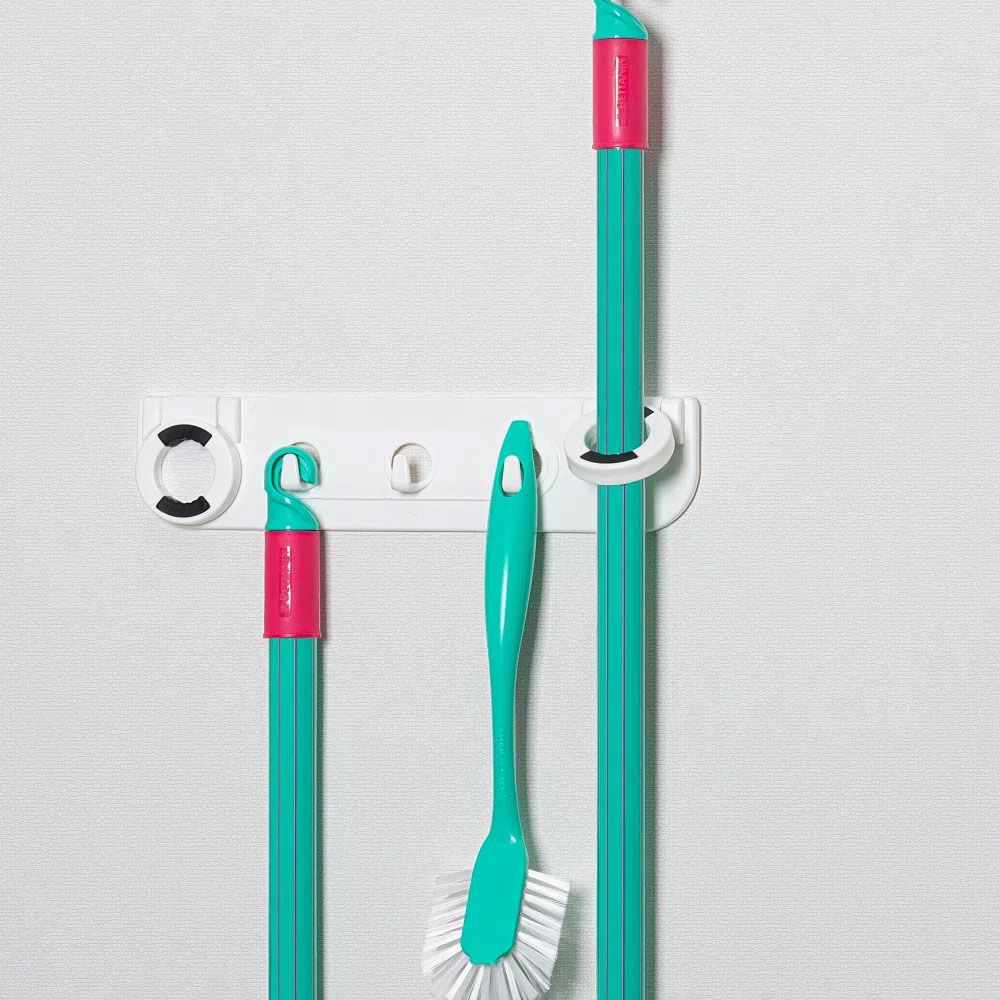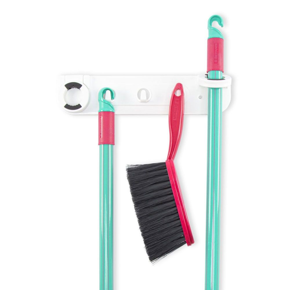 - Material: Polipropileno - Dimensiones del producto: 27,6 x 6,2 x 2,3 cm - Soporte de plástico ideal para colgar escobas, escobillas de goma, palas y otros utensilios de limpieza - Capacidad para 5 Utensilios. - Tiene 2 ranuras y 3 ganchos. - Viene con tornillos y tacos