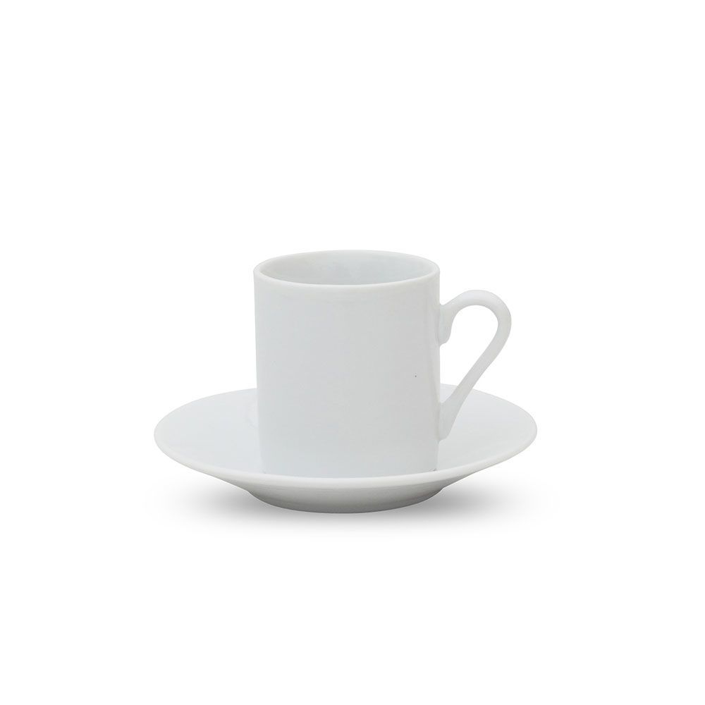 Taza con plato 110 ml. en porcelana blanca, de alta calidad y resistencia, para uso en microondas y lavavajillas, su material evita guardar olores y no se mancha.