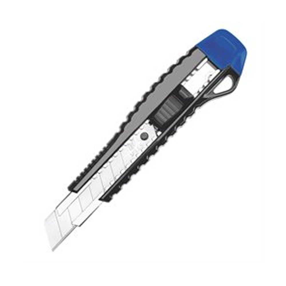 Cortante con mango ergonómico y depósito para cuchillas de repuesto incorporado. Incluye dos cuchillas extra. Cuerpo de plástico y canal de metal. Cuchilla de 18 mm de ancho desprendible de 8 segmentos. Además tiene agujero para colgar y bloqueo automático. Usado para: Papel, cartón, vinilo, película de vidrio, láminas de plástico y mas.