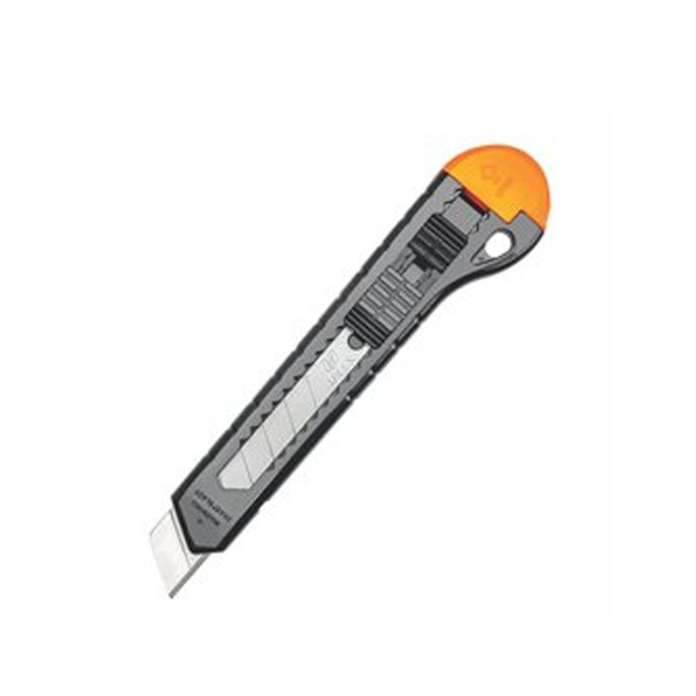 - Cuerpo de plástico y cuchilla de 18 mm de ancho.- Cuchilla desprendible de 8 segmentos.- Además tiene agujero para colgar.- Bloqueo manual.- Usado para: Corte en general, papel, cartón, film plástico, film retráctil, etc.