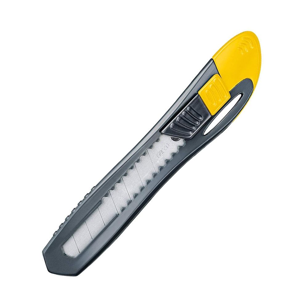 Trincheta ancha de plástico para cuchillas de 9mm de ancho. Cuenta con un diseño ergonómico con bloqueo de seguridad manual de la cuchilla.